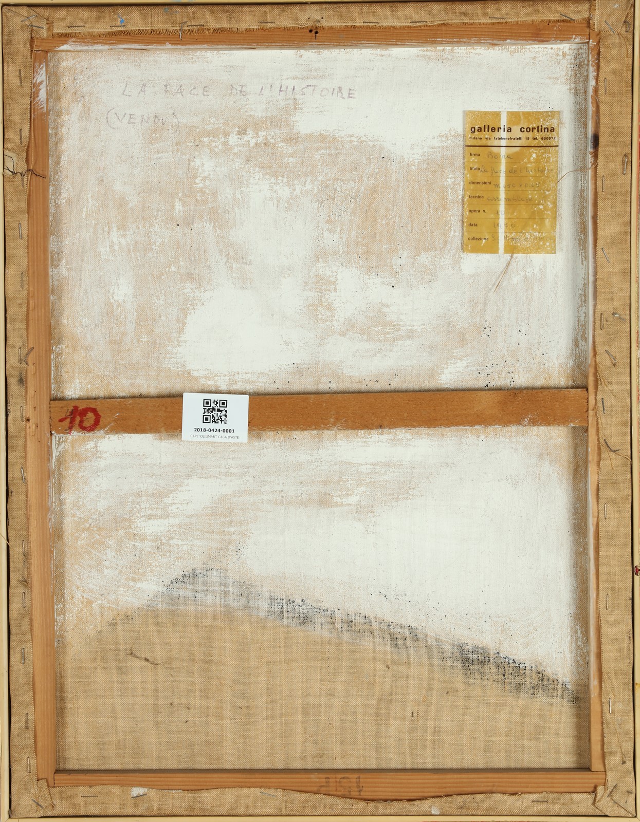 TIBERTELLI DE PISIS BONA (1926 - 2000) La face de l'histoire. Tecnica mista su tela. Cm 50,00 x 65,00. Firma in basso a destra. Al retro titolo e cartiglio descrittivo Galleria Cortina, Milano. Cornice presente
