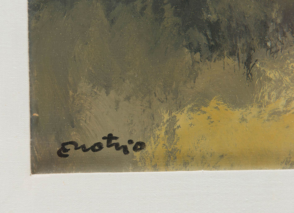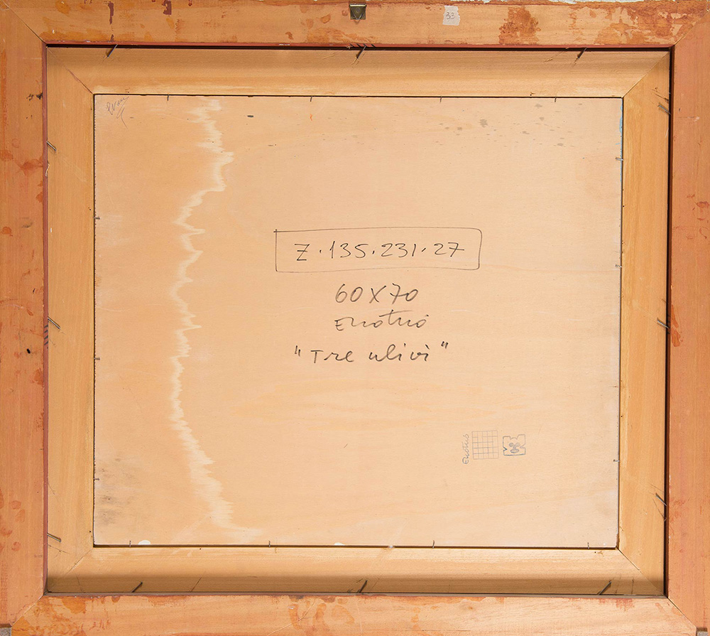 Enotrio Pugliese (Buenos Aires 1920 - Pizzo 1989), “Tre ulivi”. Olio su tavola, firmato in basso a sinistra Enotrio, opera firmata e titolata al retro ‘Enotrio - Tre ulivi’, H cm 60x70