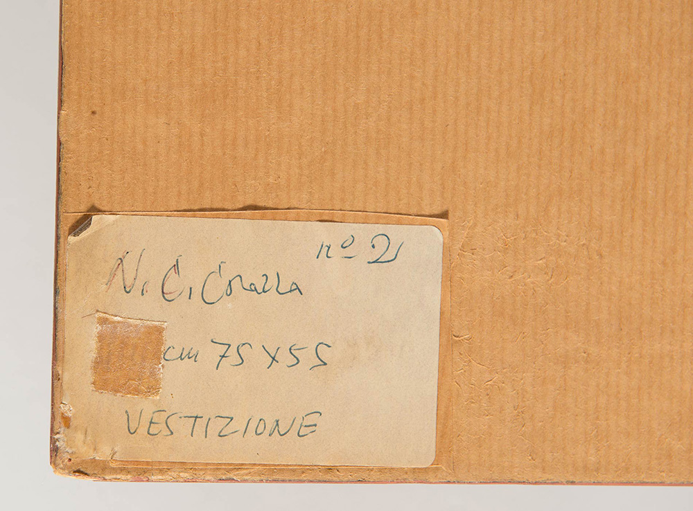 Nino Corrado Corazza (Bologna 1897 - 1975), “La vestizione”, 1970. Olio su tela, firmato in basso a destra Corazza, al retro reca firma, titolo e data ‘N. C. Corazza - “La vestizione” - 1970’, H cm 56x71