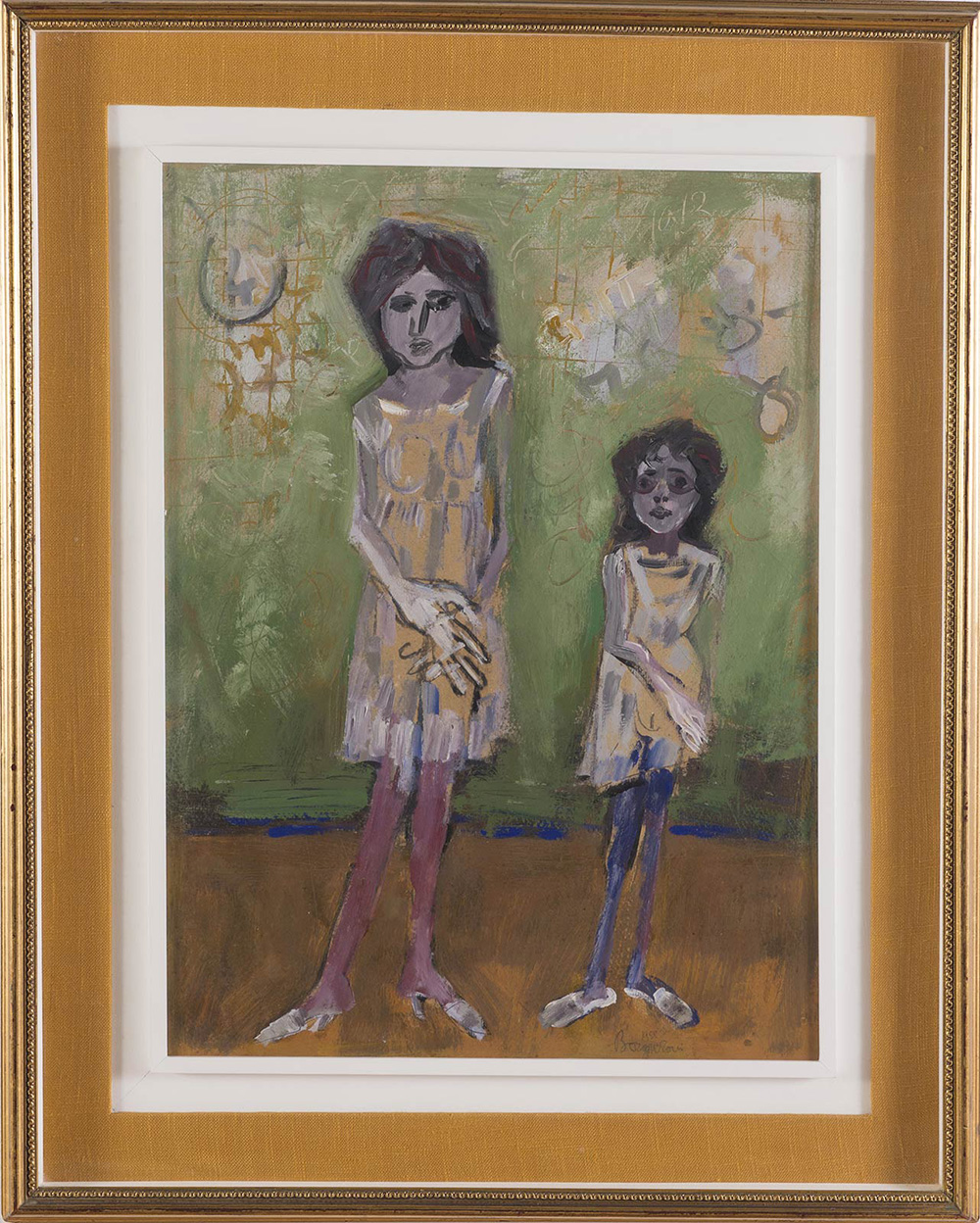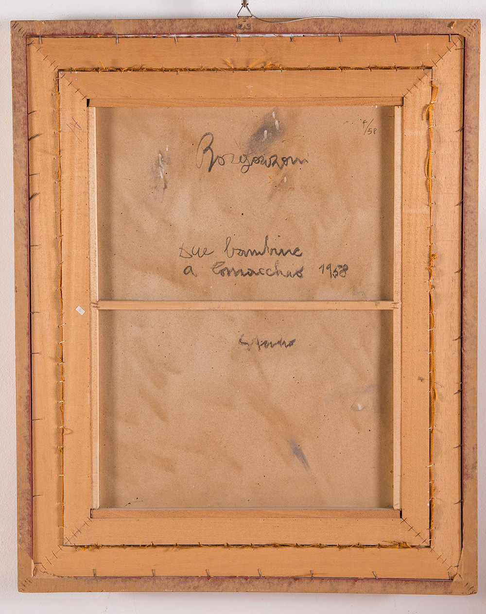 Aldo Borgonzoni (Medicina 1913 - Bologna 2004), “Due bambine a Comacchio”, 1958. Olio e tecnica mista su cartone, firmato e datato in basso a destra Borgonzoni 1958, al retro opera firmata, titolata e datata ‘Borgonzoni - “Due bambine a Comacchio” - 1958’, H cm 64.5x47.5