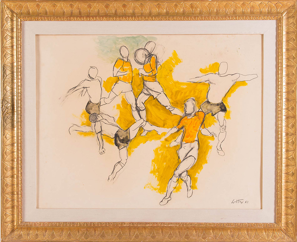 Renato Guttuso (Bagheria 1911 - Roma 1987), “Calciatori”, 1963. Tempera su carta intelata, firmata e datata in basso a destra Guttuso ‘63, H cm 68.5x88