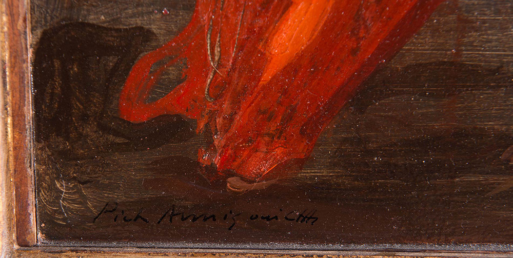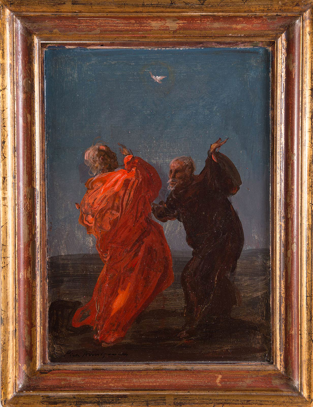 Pietro Annigoni (Milano 1910 - Firenze 1988), “Eremiti e apparizione”. Olio su tavola, firmato in basso a sinistra Pietro Annigoni, H cm 36x26