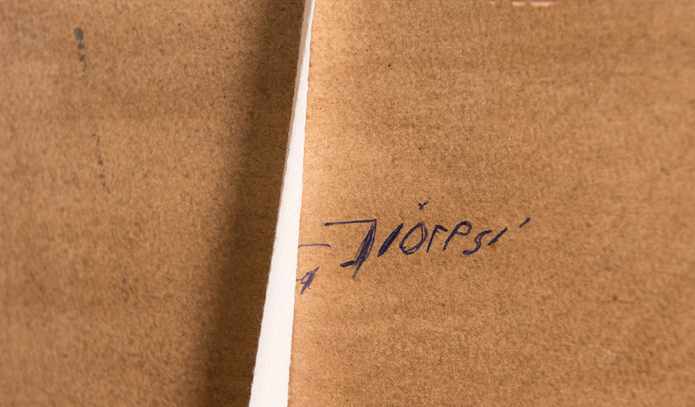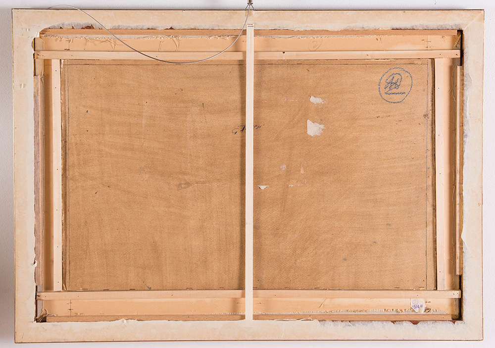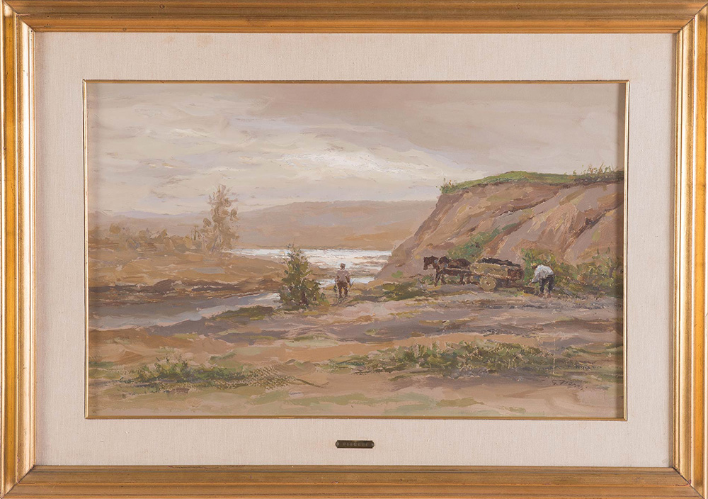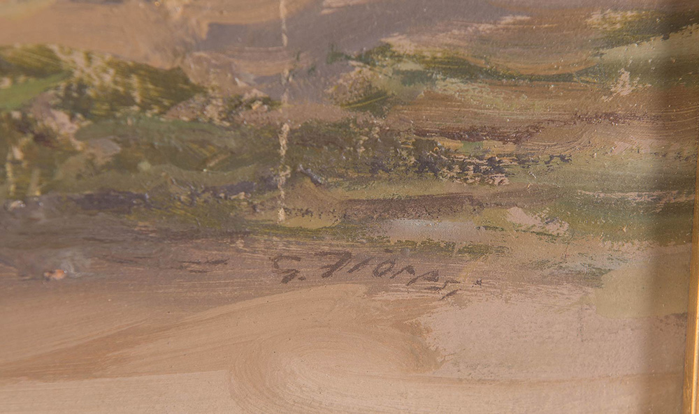 Garzia Fioresi (Vigevano 1888 - Bologna 1968), “Paesaggio con figure e armenti”. Olio su cartone, firmato in basso a destra G. Fioresi, firmato al retro G Fioresi, H cm 45.5x74