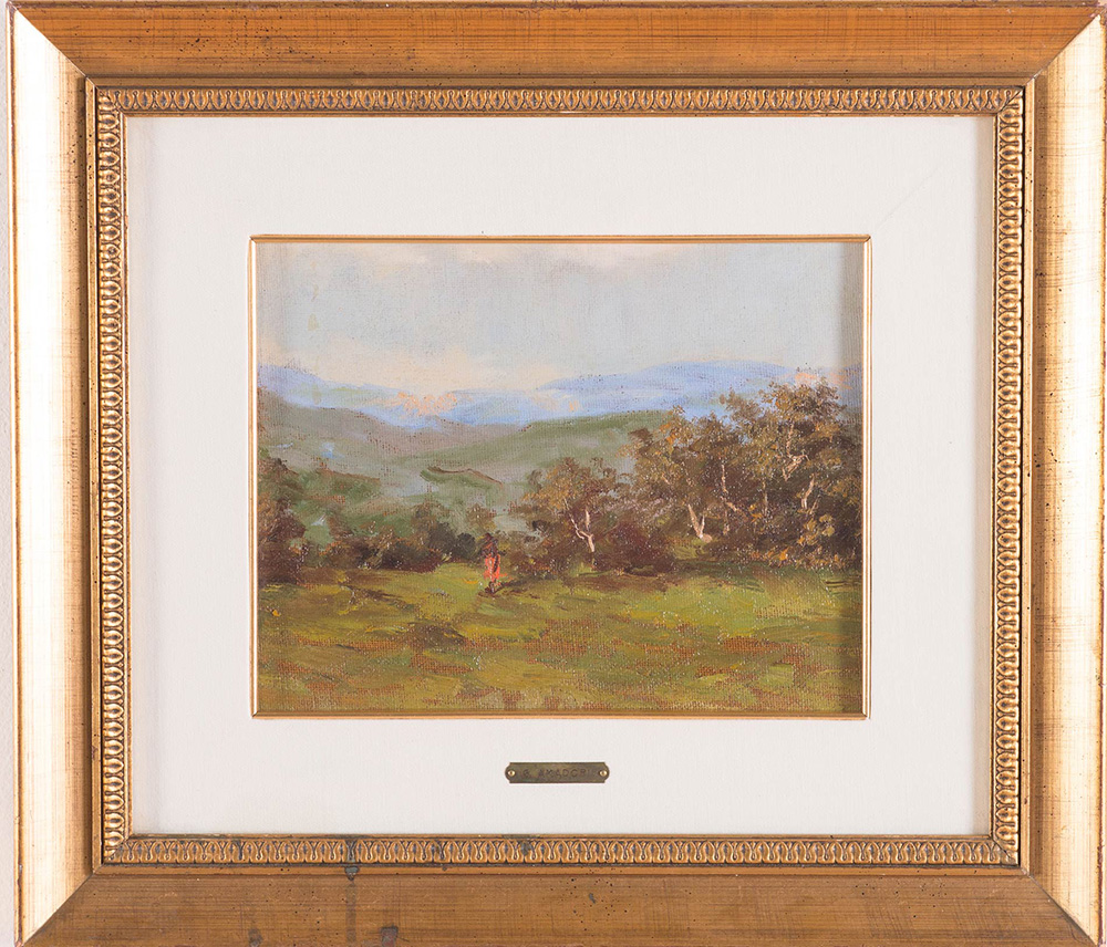 Lot 138 | Giuliano Amadori (Bologna 1883 - 1972), “Paesaggio con figura in rosso”. Olio...