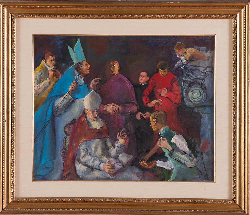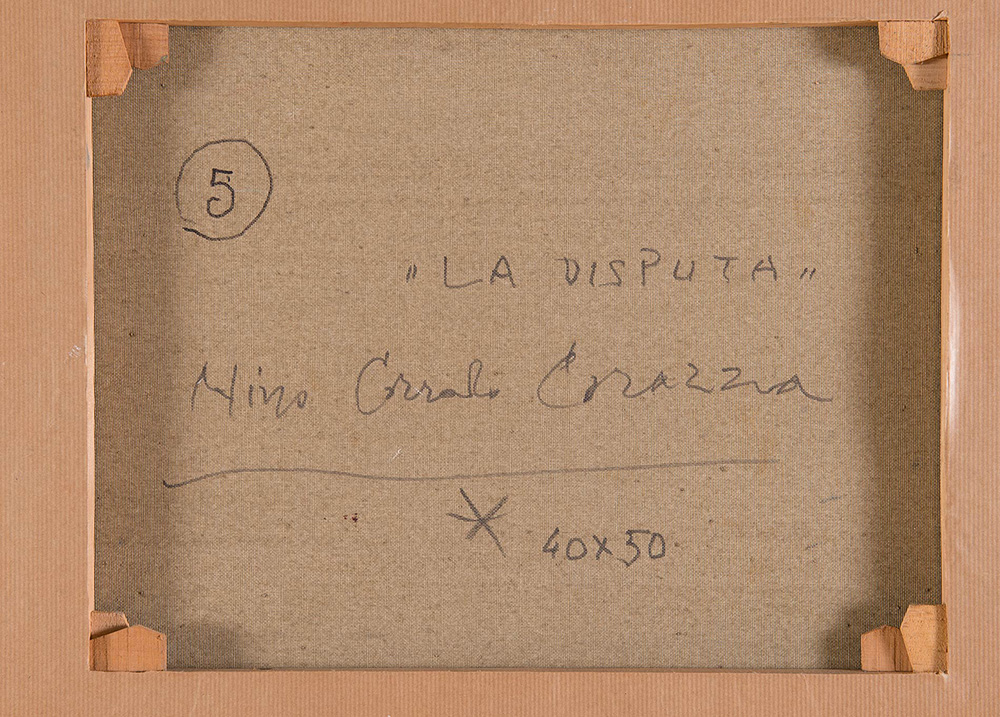 Nino Corrado Corazza (Bologna 1897 - 1975), “La Disputa”. Olio su tela, firmato e titolato al retro ‘Nino Corrado Corazza - La disputa’, H cm 40x50