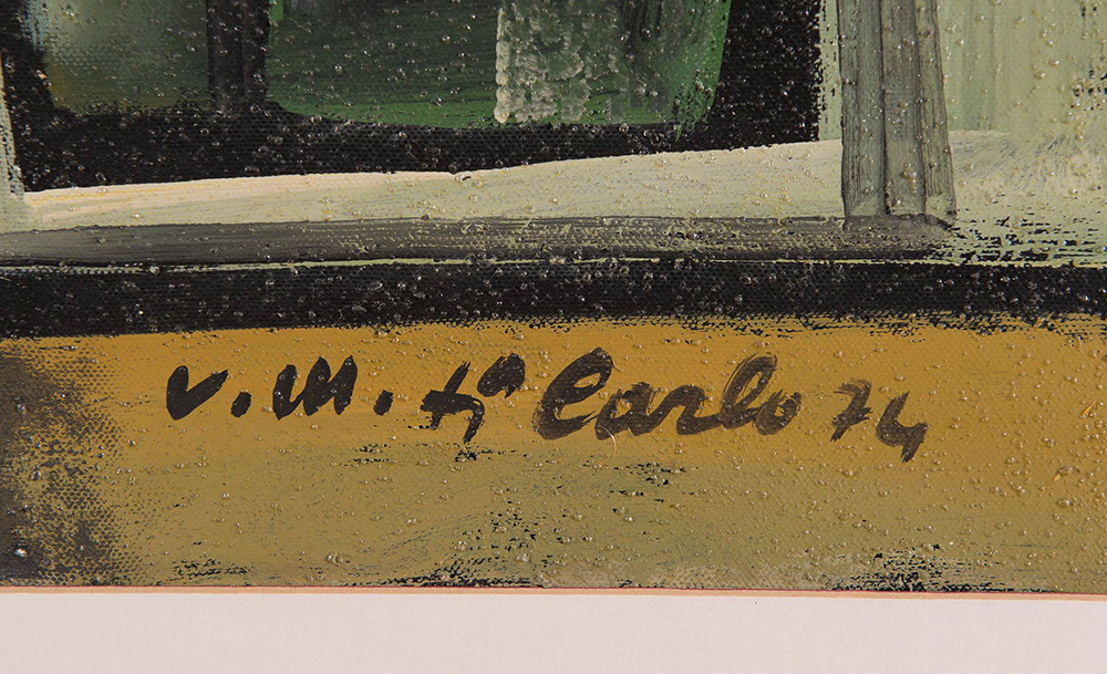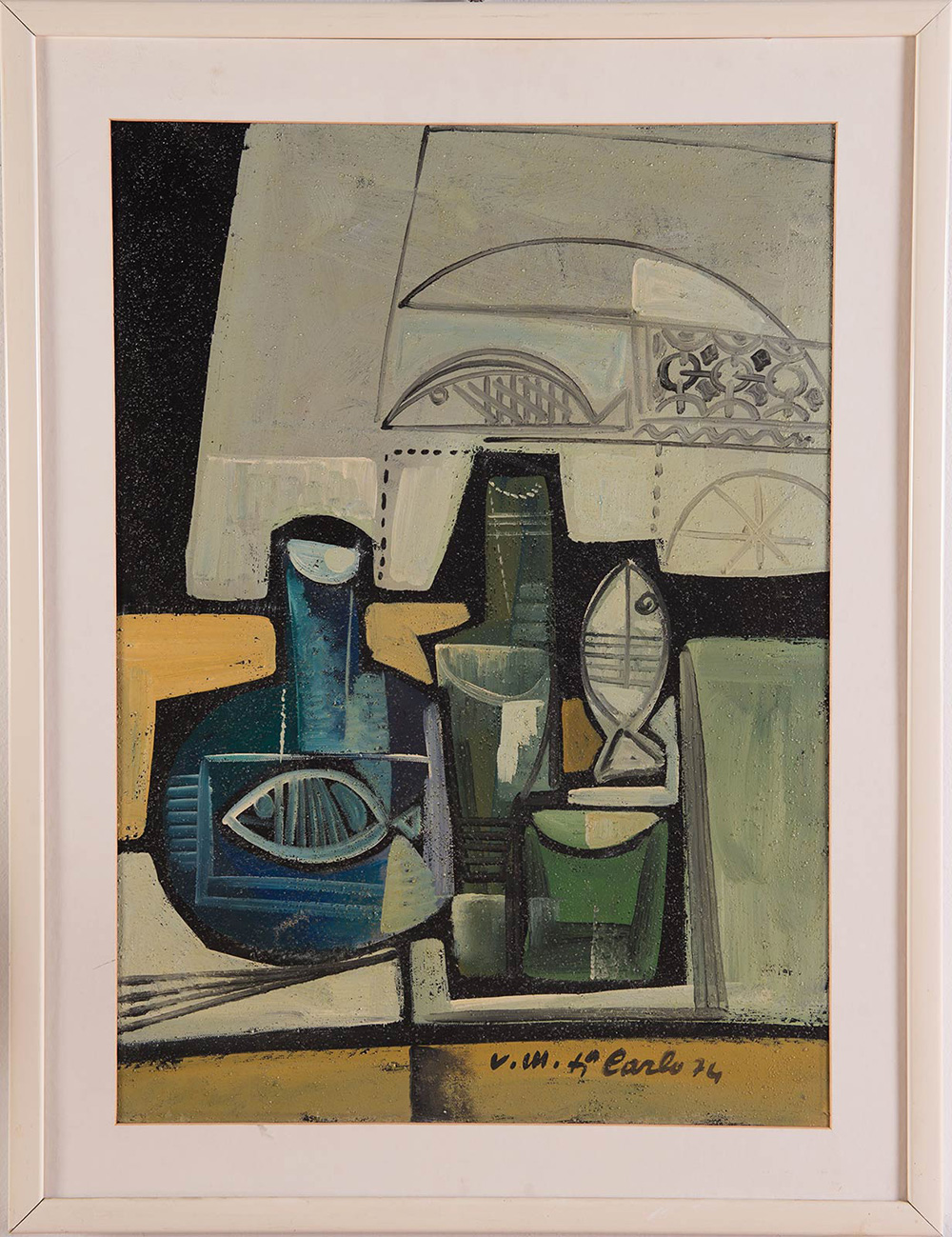 Vittorio Maria Di Carlo (1939 - 2015), “Natura morta”, 1974. Olio e tecnica mista su tela, firmato e datato in basso a destra V.M. Di Carlo 74, H cm 70x50