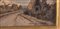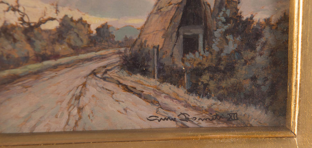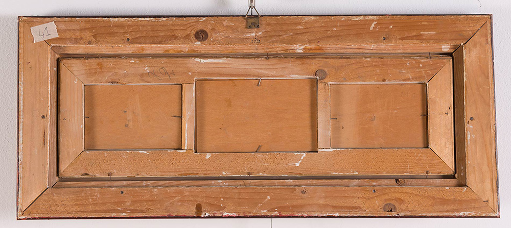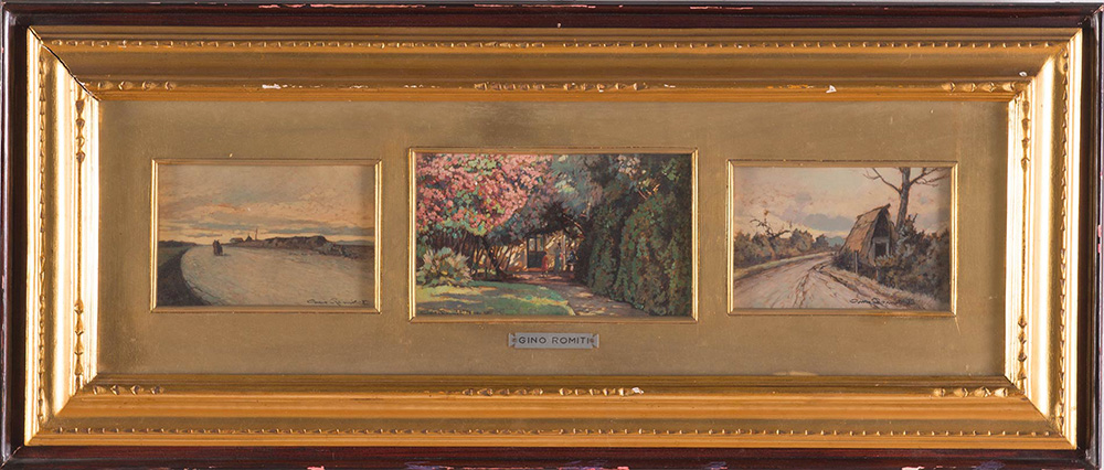 Gino Romiti (Livorno 1881 - 1967), “Paesaggi”. Opera composta da tre oli su tavoletta entro unica cornice: “Strada con due figure”, firmato in basso a destra Gino Romiti, H cm 10x15. “Cortile”, firmato in basso a sinistra Gino Romiti H cm 11.5x19. “Scorcio di montagna”, firmato in basso a destra Gino Romiti, H cm 10x15
