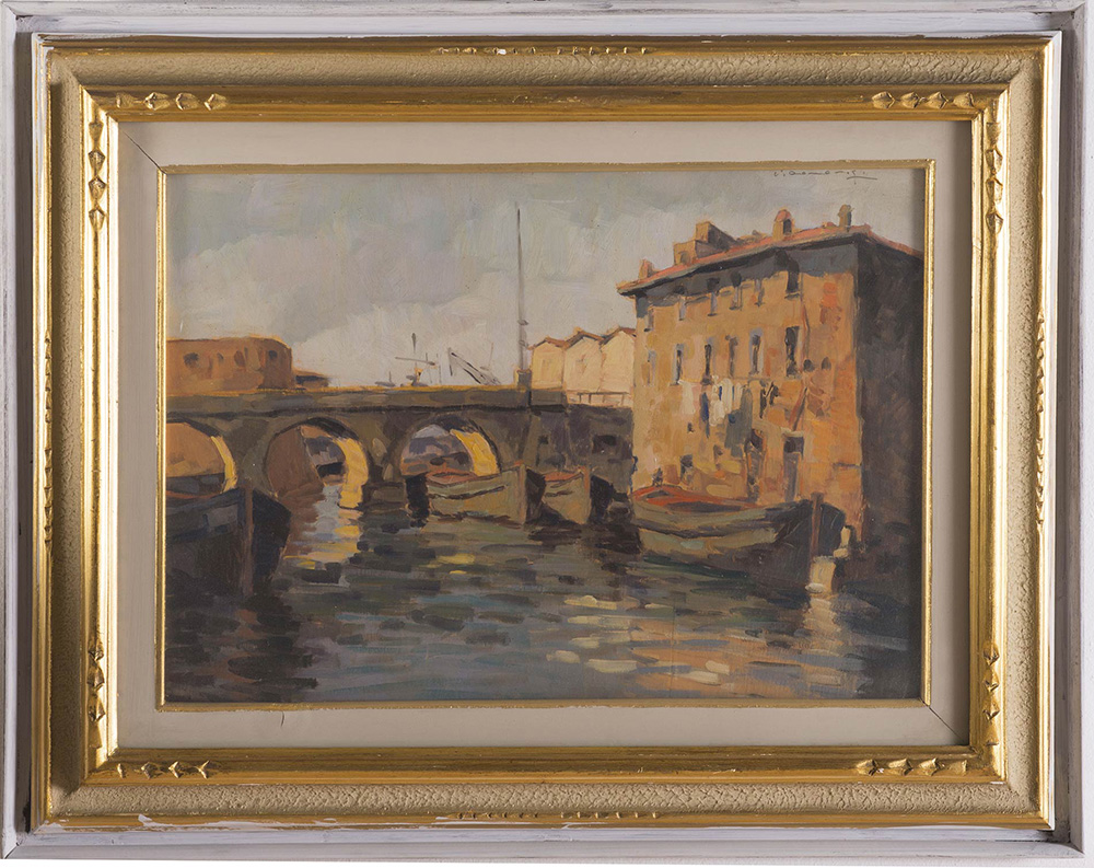 Lot 228 | Carlo Domenici (Livorno 1897 - Portoferraio 1981), “Barche ormeggiate”. Olio...