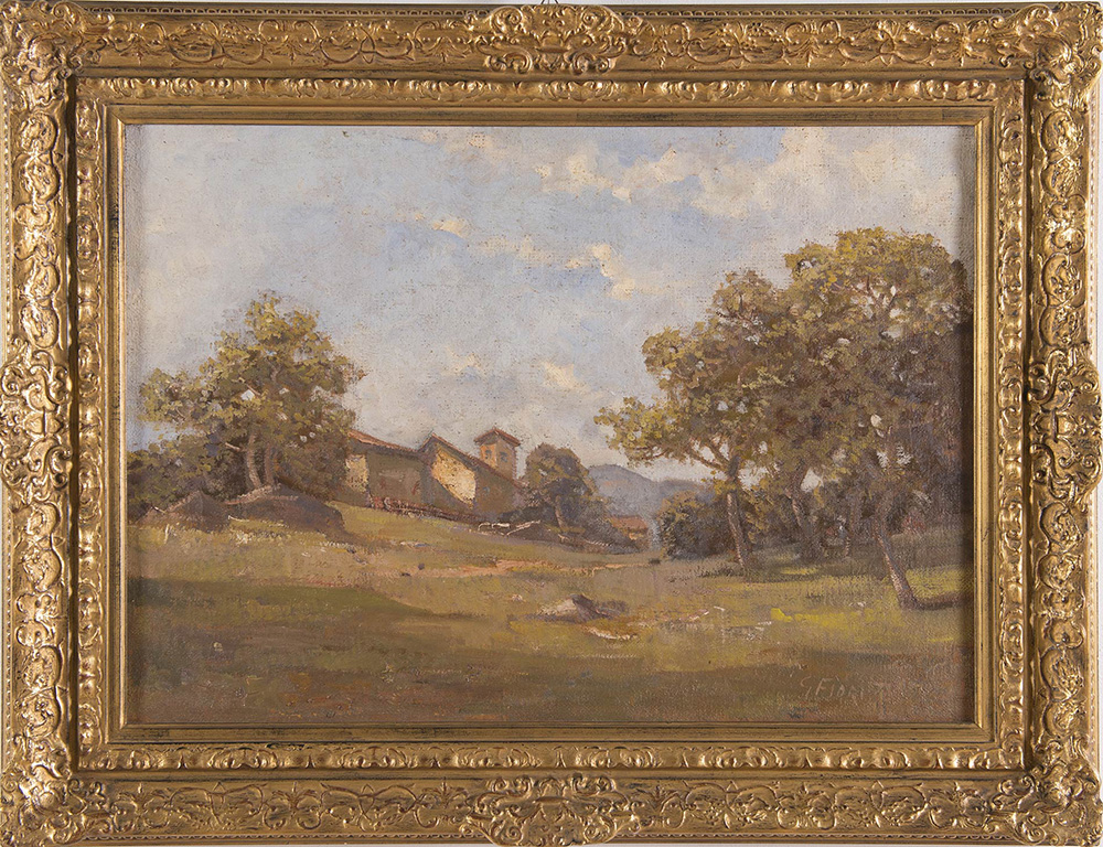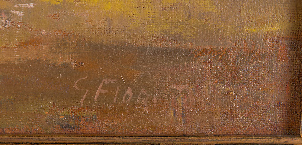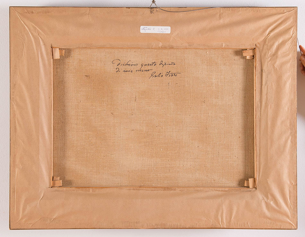 Giulio Fiori (Bologna 1909 - 1991), “Paesaggio”, 1976. Olio su tela, firmato in basso a destra G. Fiori, al retro reca iscrizione ‘Dichiaro questo dipinto di mia mano - Giulio Fiori’, H cm 50x70