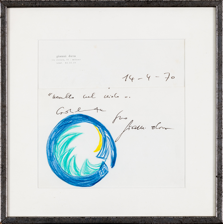 Bozzetto realizzato con pastelli colorati su carta intestata dell'Artista (trattasi di una lettera inviata dall'Artista all'Editore dei piatti 'Uccello nel cielo')