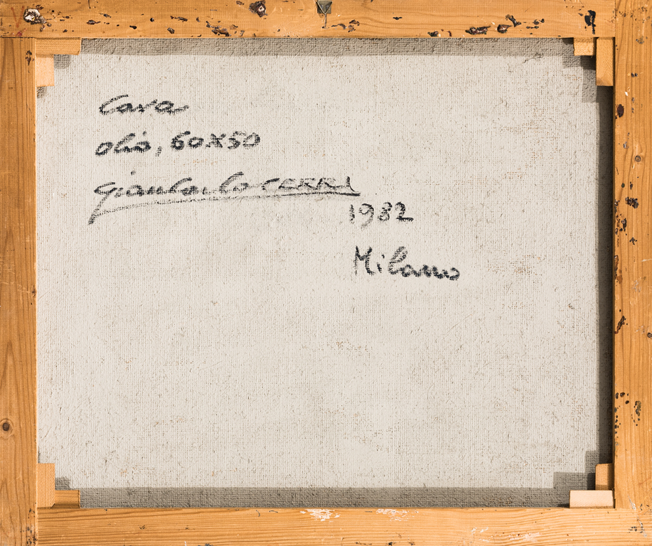 Firma, titolo, datazione, tecnica, misure e località (Milano) al retro
