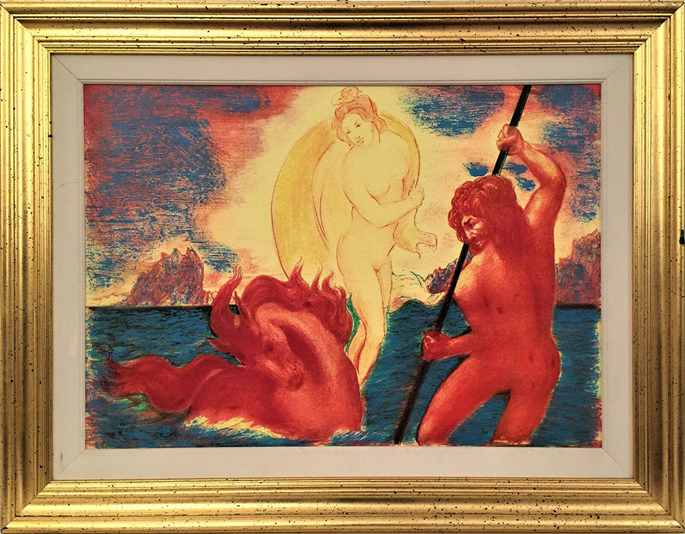 SASSU ALIGI Milano 1912 - Pollença 2000 Poseidone dona il cavallo ad Athena litografia su compensato 70x50 tiratura in basso a sinsitra 73/250 Timbro editore ART'È al retro