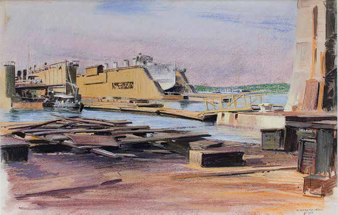 ADOLF HIREMY HIRSCHL Temesvar 1860 – Roma 1933 SHIPYARD IN POLA, 1916 pastelli su carta grigia, cm 32,5x50. Firmato e datato in basso a destra: A. Hiremy Pola IX 916. Esposizioni: Londra, Matthiesen Fine Art Ltd., Hirémy Hirschl, 11 Giugno - 31 Luglio 1987; Bibliografia: Hiremy Hirschl, catalogo della mostra, Allemandi, Torino 1987, n. 79