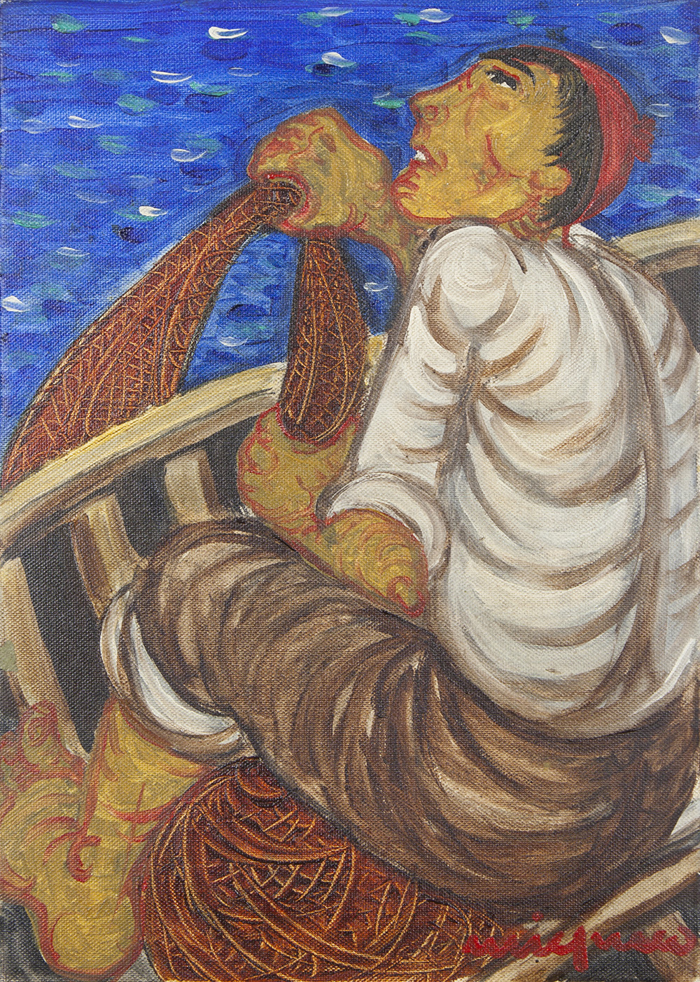 Giuseppe Migneco Messina 1903 – Milano 1997 "Pescatore" olio su tela anno 1990 cm 35x25 firmato in basso a destra; al retro timbro Catalogo Generale con n. repertorio Certificato di autenticità rilasciato dal Maestro su cui vi è apposto timbro Catalogo Generale con n. repertorio