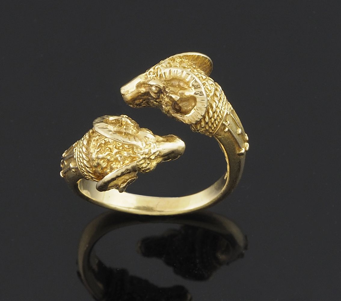 Anello in oro giallo con due teste di arieti. Gr. 12,4