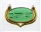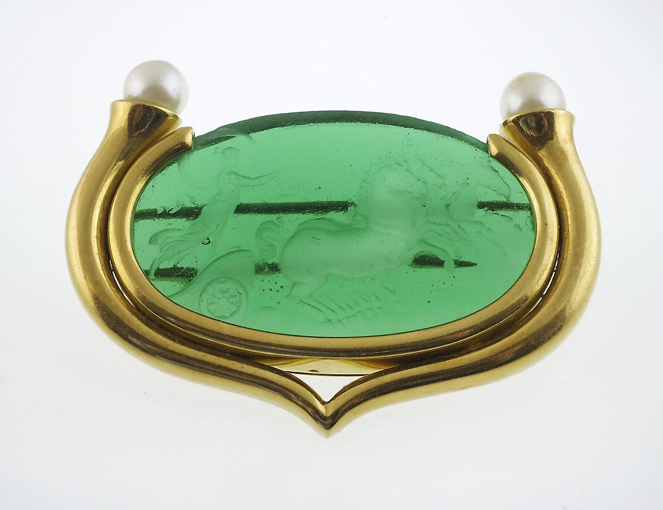 Spilla in oro giallo di forma ovale con all'estremità due perline parte centrale cristallo verde inciso
