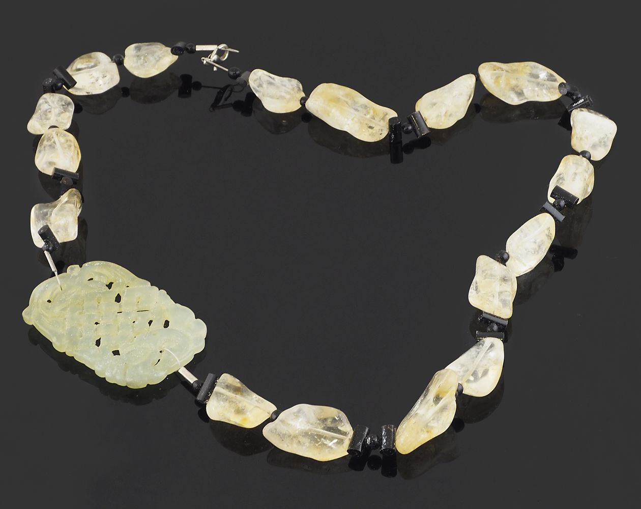 Collana in cristallo di Rocca, corallo nero e piastra in giada.