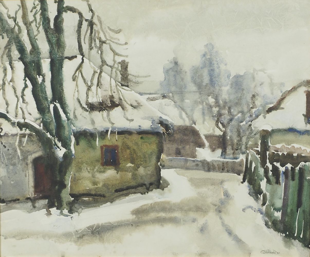 Giovanni Giordani 1884-1964 "Paesino sotto la neve" cm. 50x60 - acquerello su carta Firmato b. a d.