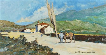 G. Dominici "Paesaggio con case" cm. 23x43 - olio su tavola Firmato b. a d.