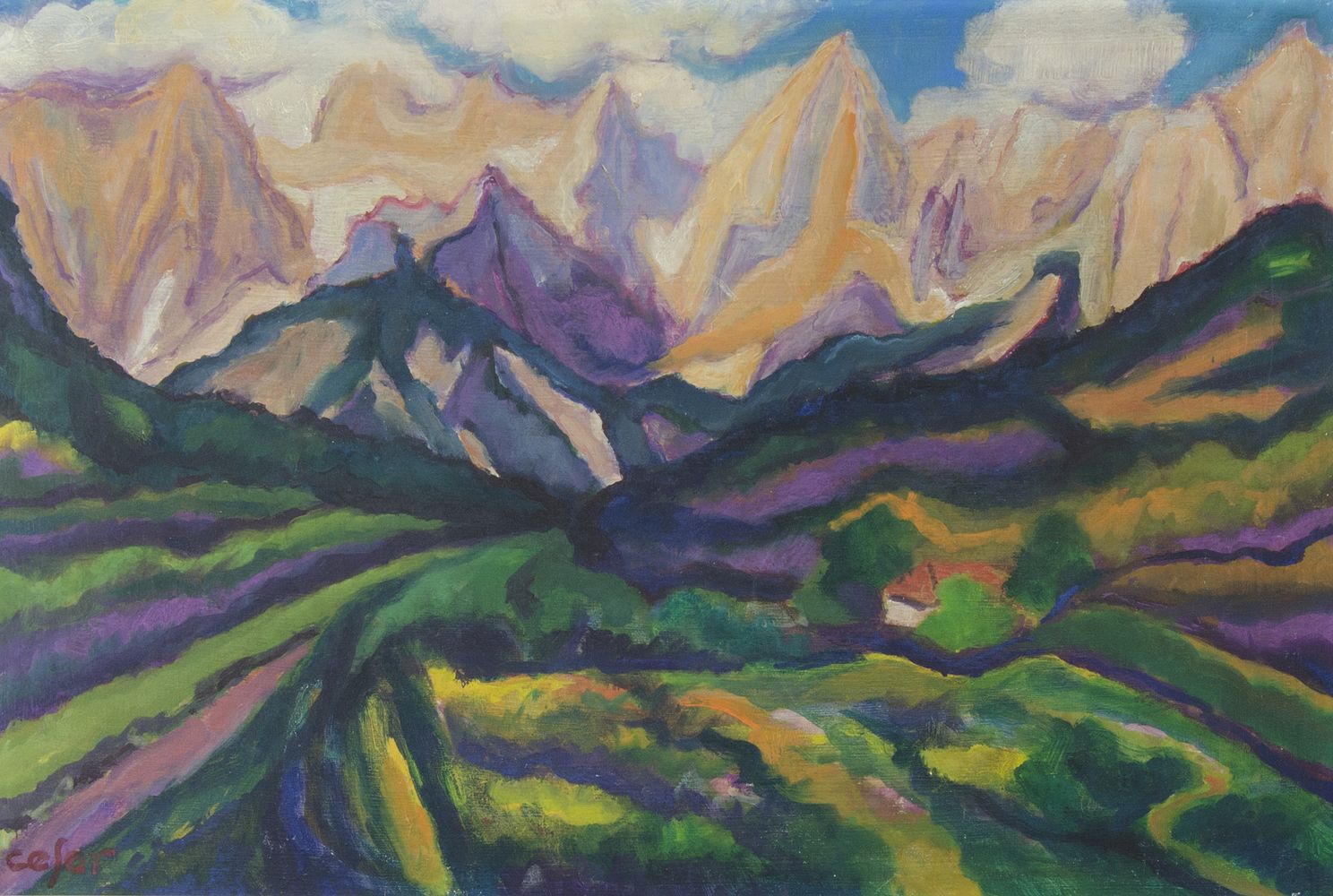 Joze Cesar 1907-1980 "Veduta sulle Dolomiti" cm. 40x60 - tecnica mista su compensato Firmato b. a s.
