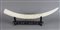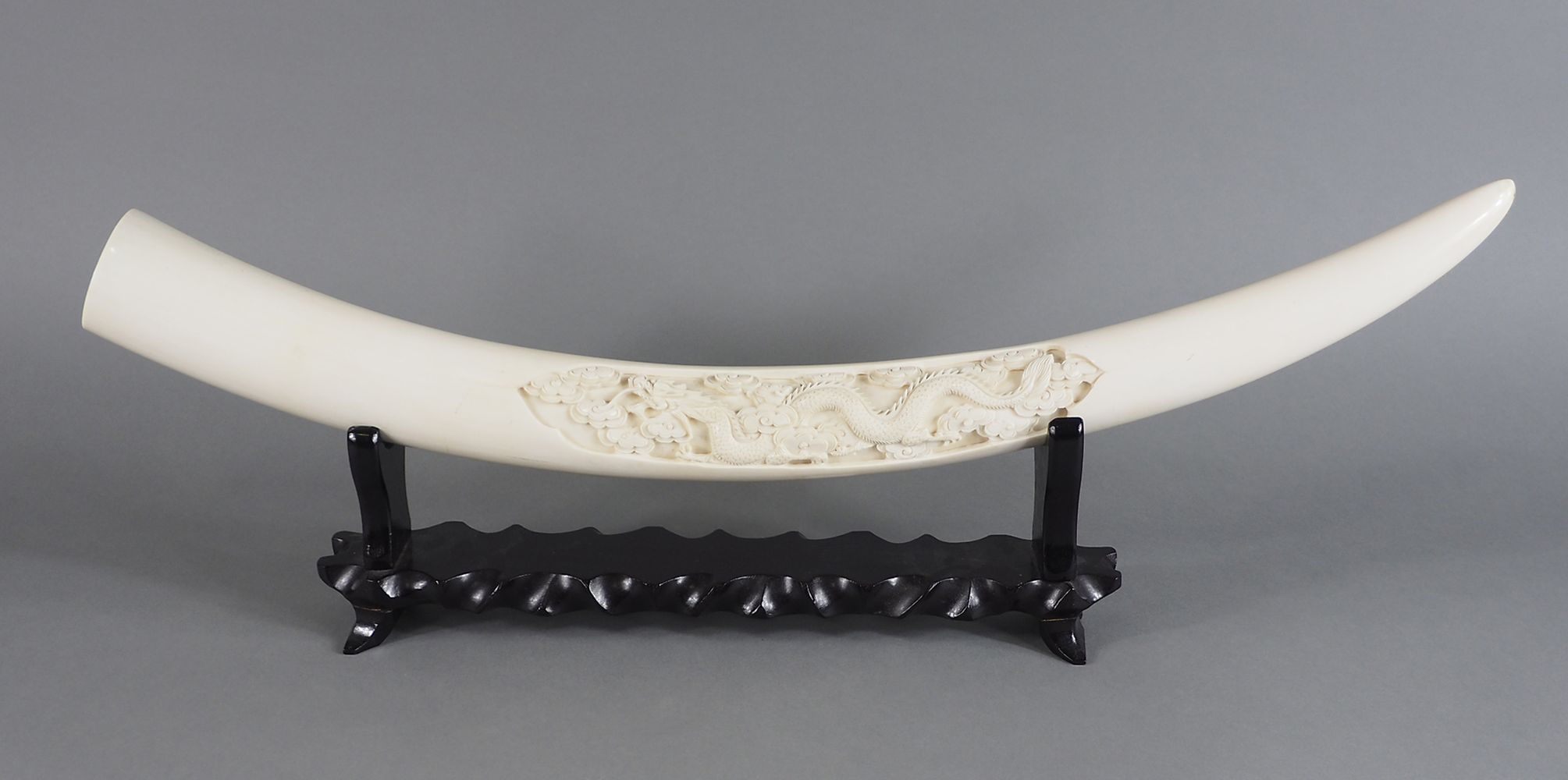 Grande zanna antica in avorio finemente scolpita con figure di draghi orientali, base in legno nero. Inizio XX secolo. Lung cm. 70.