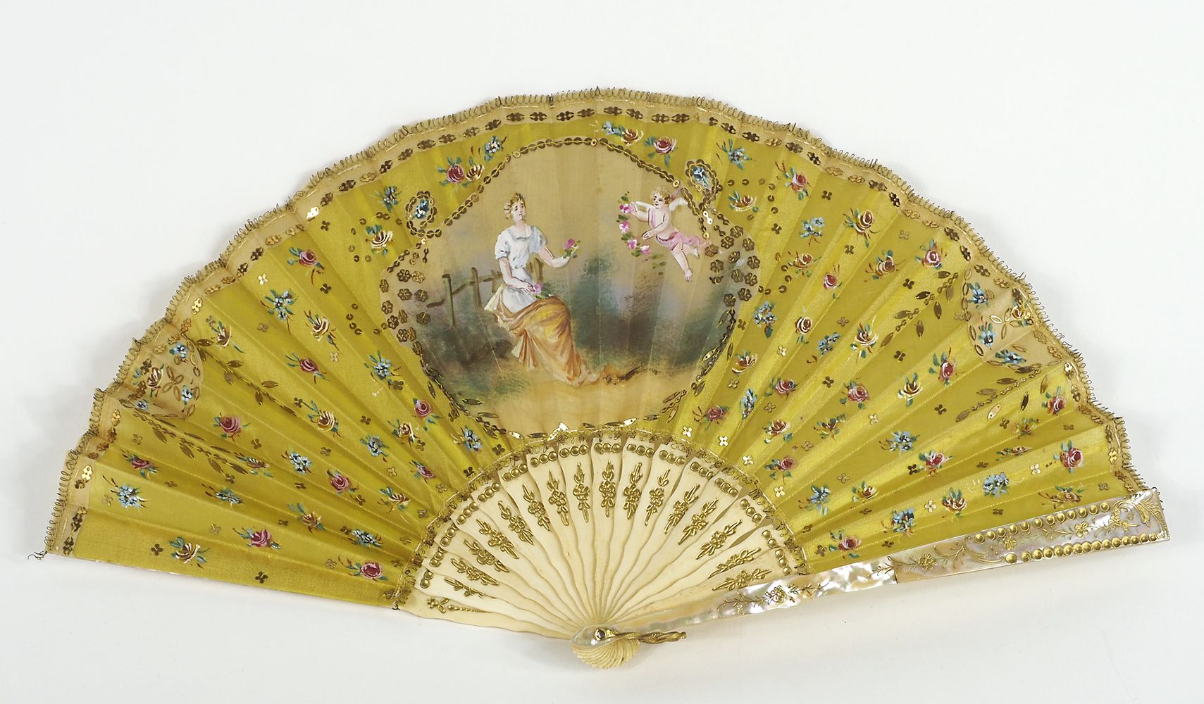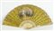 Piccolo ventaglio con stecche in madreperla e decoro dorati. Inizio XX secolo.