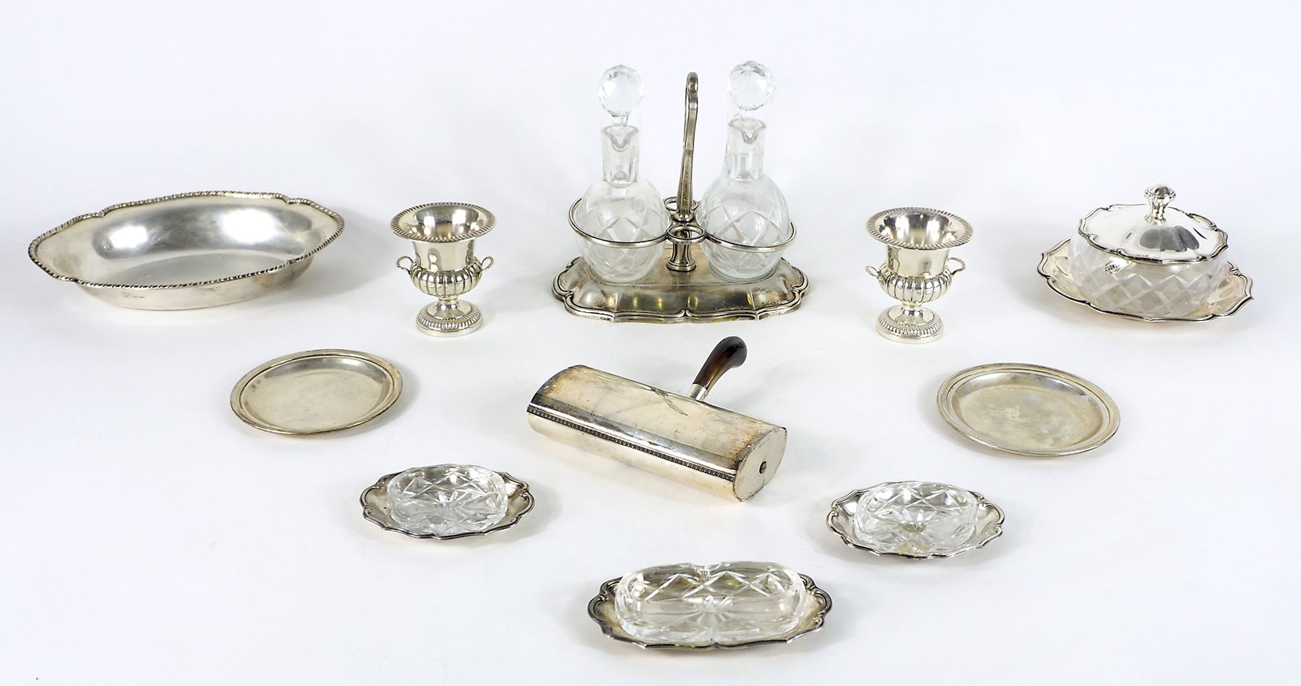 Lotto di vari oggetti in argento tra cui oliera e formaggiera. Gr. 1000.