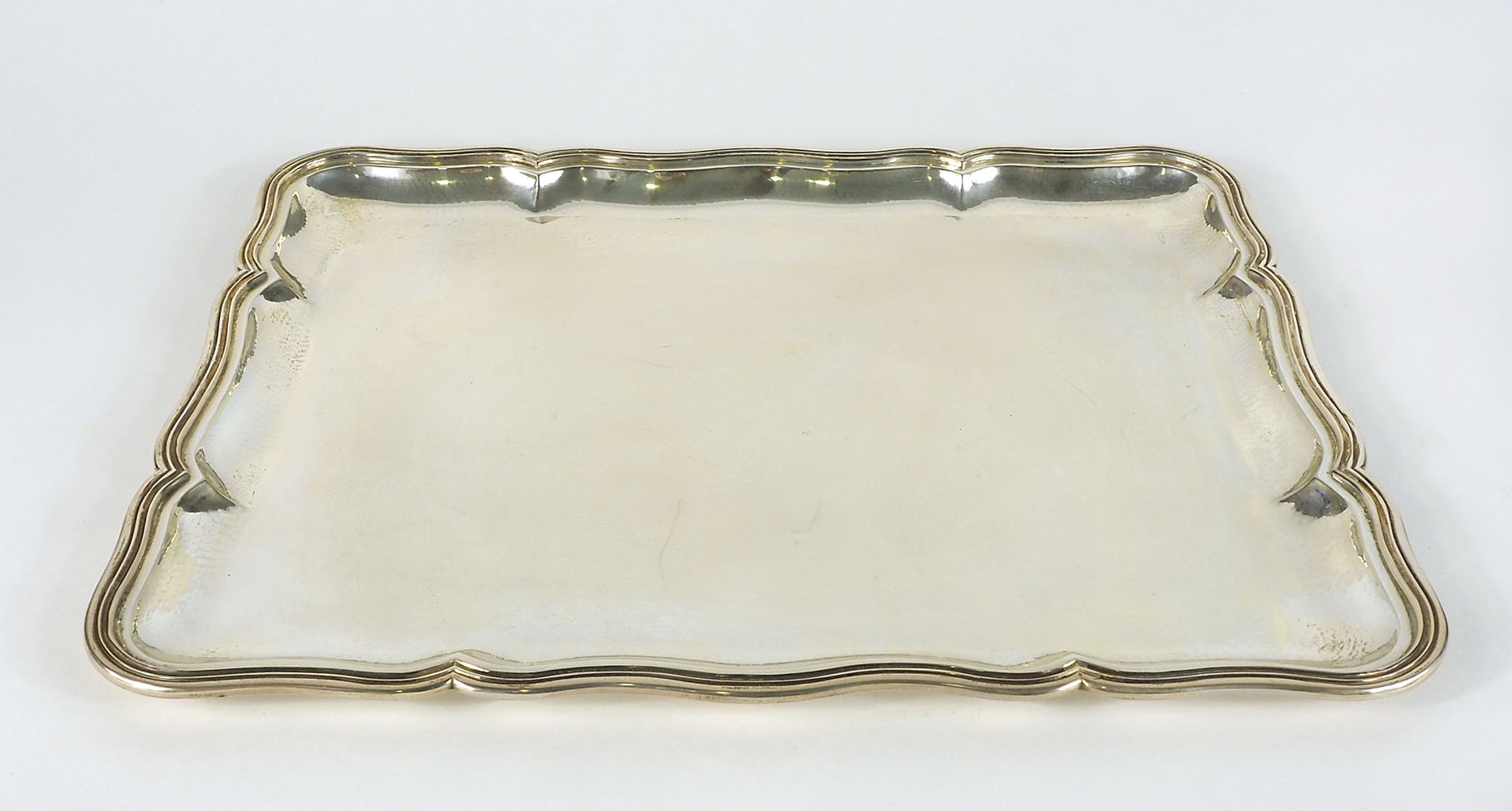 Vassoio rettangolare in argento con bordo sagomato. cm. 33x42. Gr. 1350.
