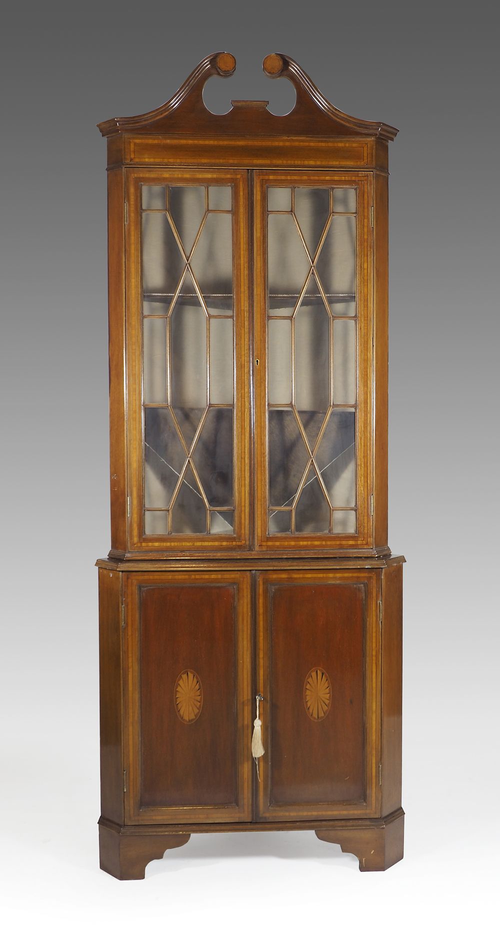 Angoliera in legno a doppio corpo, parte inferiore con anta e parte superiore a 2 ante a vetri. cm. 213x56x56.
