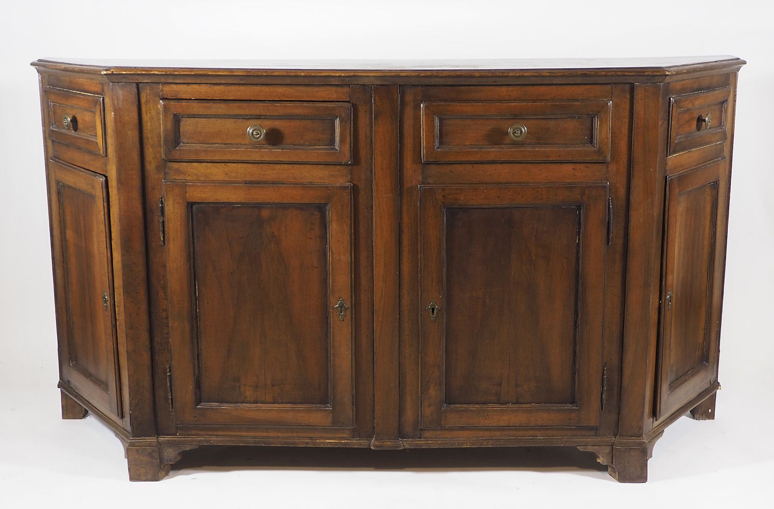 Credenza scantonata in legno a 4 ante e 2 cassetti. XIX secolo. cm. 107x200x50.