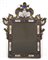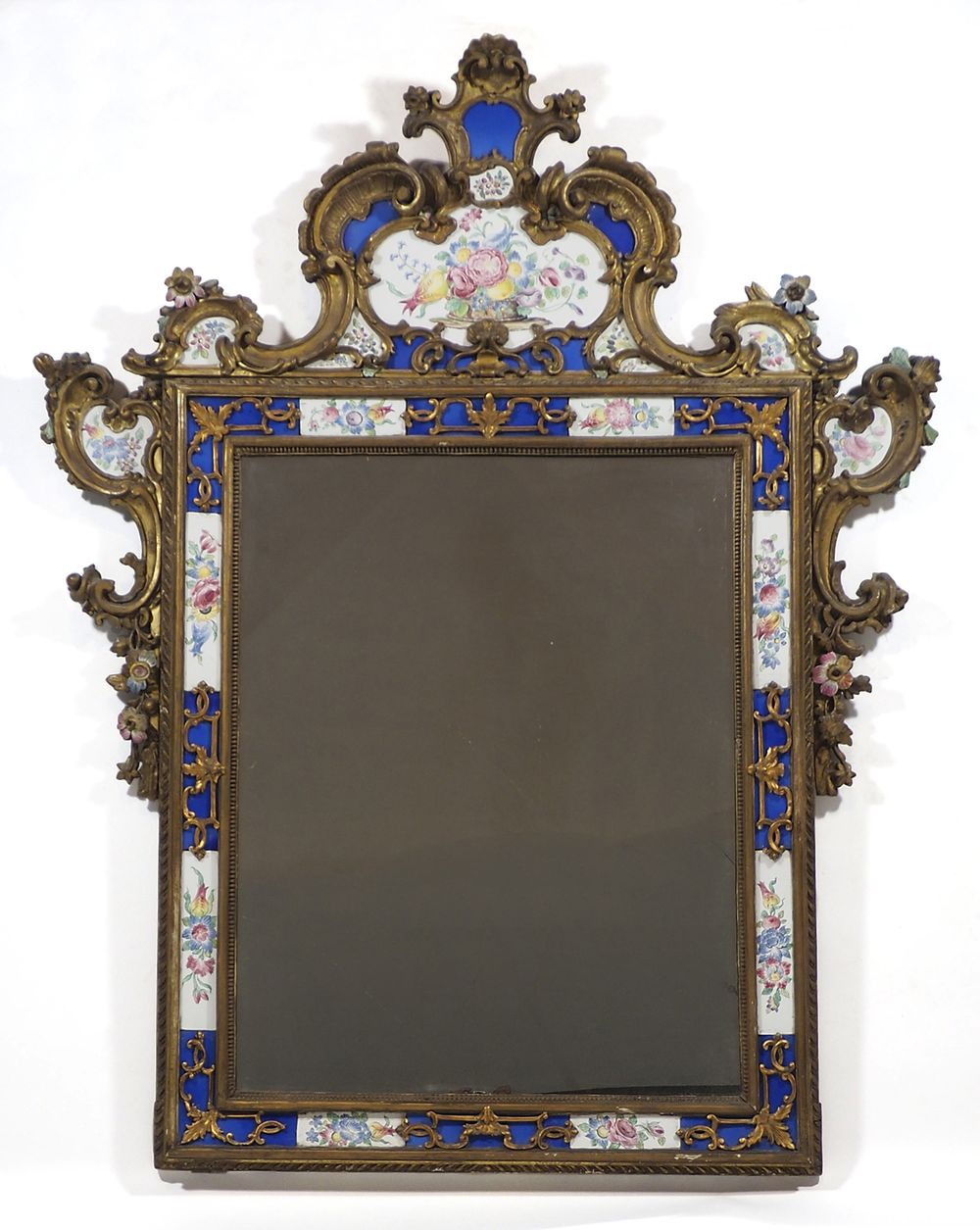 Grande specchiera rettangolare con cornice e cimase in legno dorato scolpito con applicazion di piastre in maiolica policroma decorate a motivi floreali. Veneto, XIX secolo. cm. 161x113.