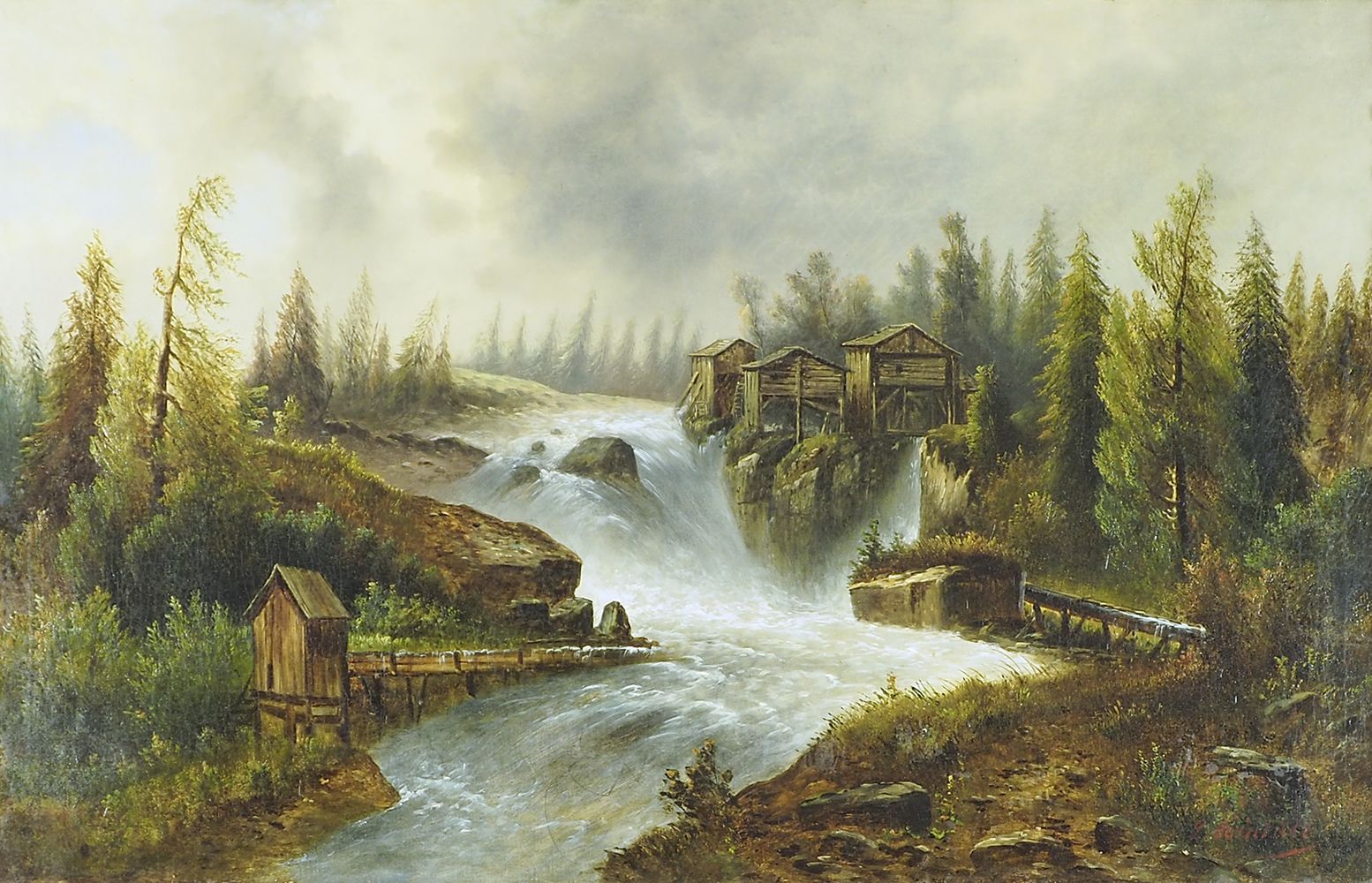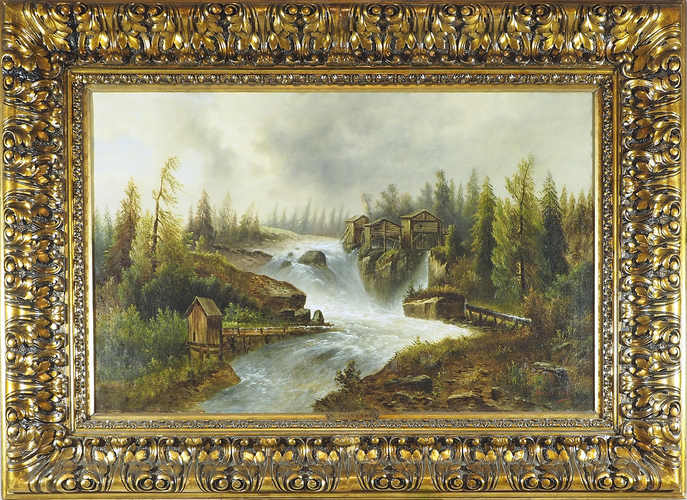 L. Pointner Attivo nel XIX secolo "Paesaggio con cascata" cm. 70x106 - olio su tela Firmato b. a d.