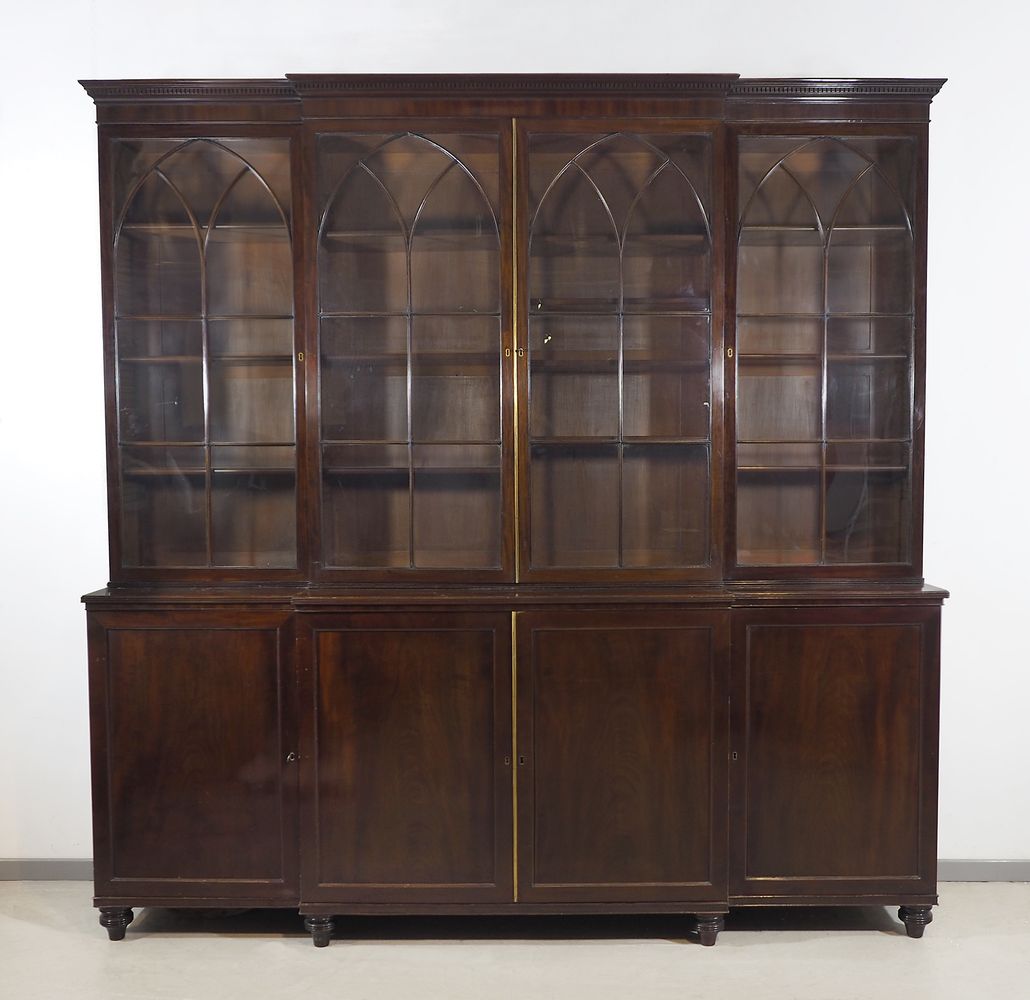 Grande libreria inglese a doppio corpo con parte inferiore a 4 ante e parte superiore a 4 ante a vetri. cm. 255x250x56.