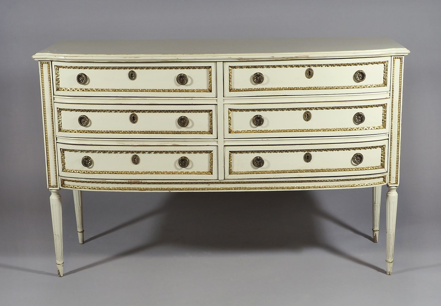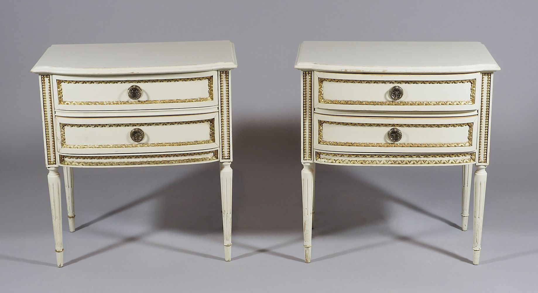 Lotto composto da cassettone e coppia di comodini in legno laccato bianco. cm. 84x128x49