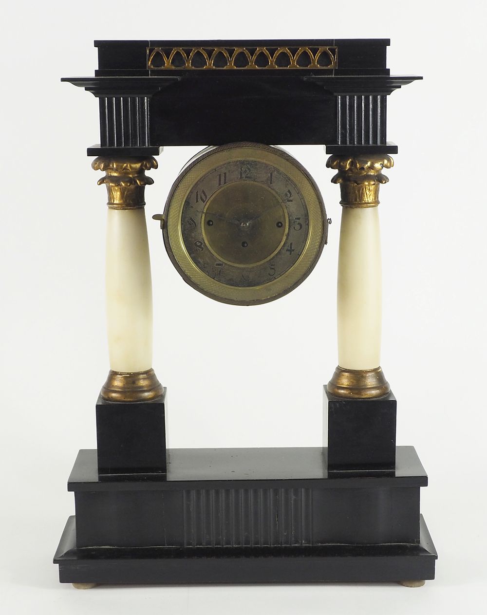Orologio da tavolo in legno nero con colonne in alabastro e applicazioni in legno dorato. XIX secolo. H. cm. 56. (senza pendolo).