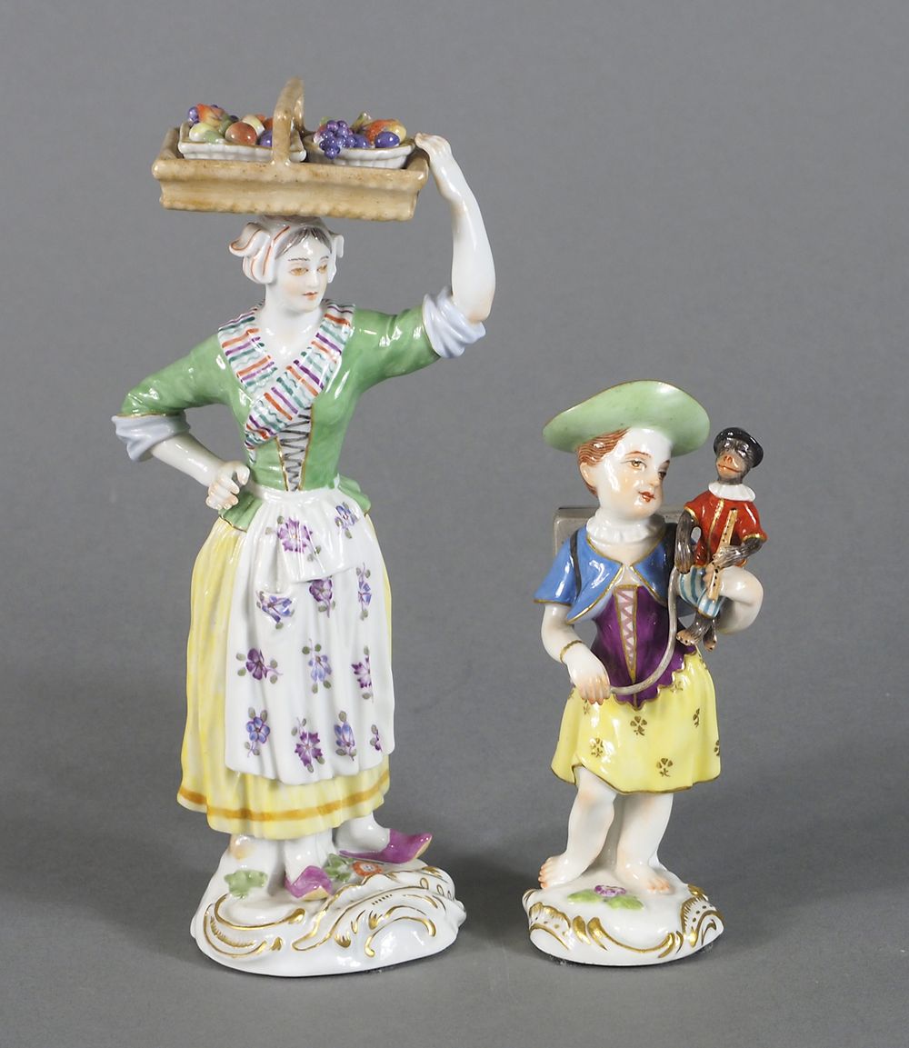 Meissen: lotto di 2 piccole statuine in porcellana policroma. H. max cm. 15.