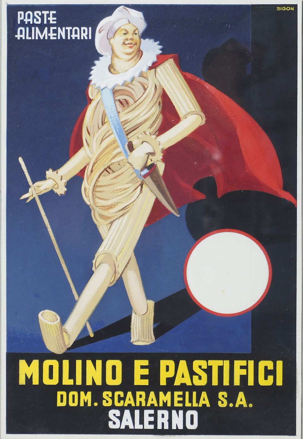 Pollione Sigon 1895-1971 "Molino e pastifici Scaramella" cm. 25x17 - bozzetto pubblicitario a tempera Firmato alto a d. Prov.: collezione Modiano Trieste.