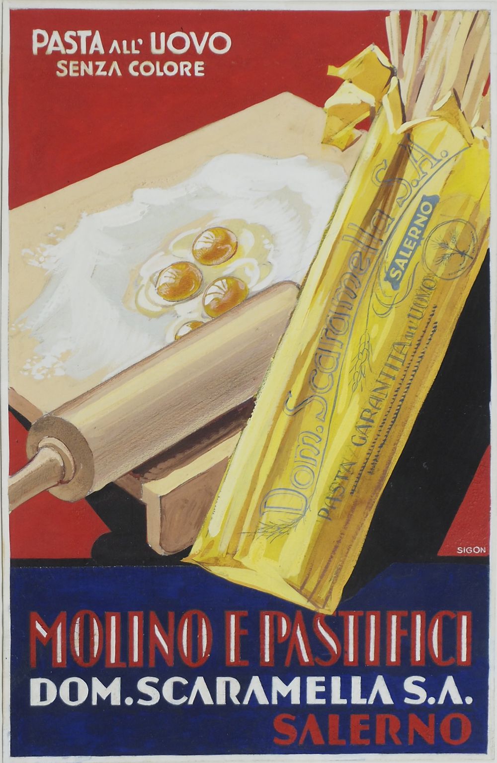 Pollione Sigon 1895-1971 "Molino e pastifici Scaramella" cm. 25x17 - bozzetto pubblicitario a tempera Firmato b. a d. Prov.: collezione Modiano Trieste.