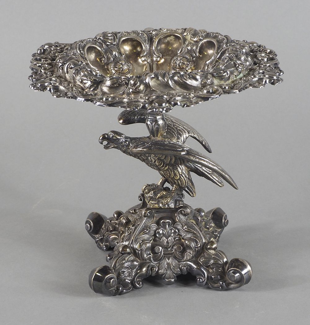 Alzata in argento con figura di aquila che sorregge una coppa. Punzone Vienna 1845. H. cm. 19. gr. 500.