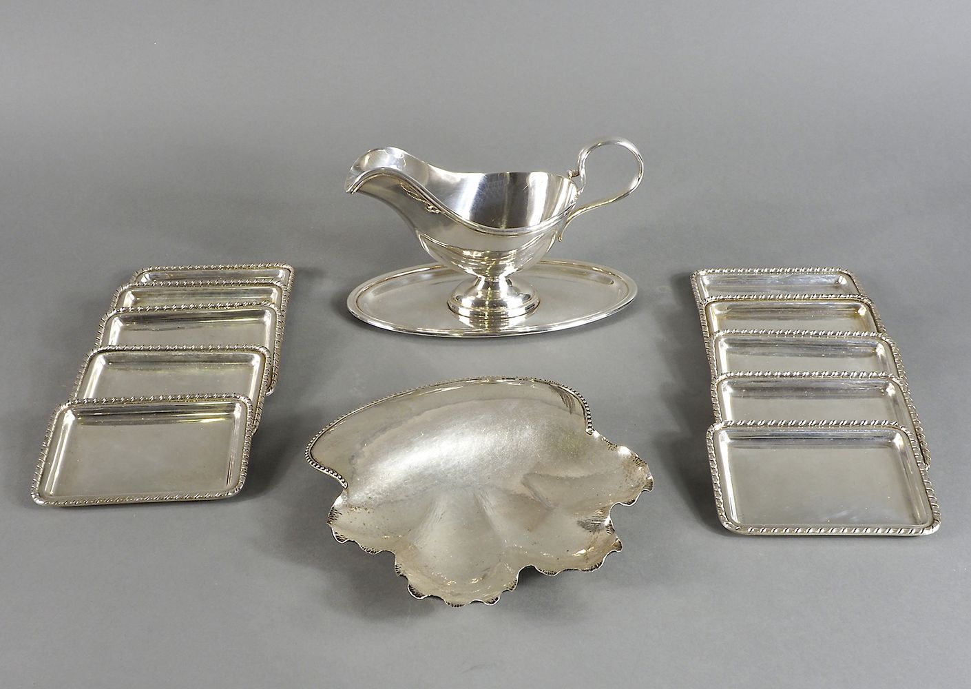 Lot 333 | Lotto di vari oggetti in argento tra cui salsiera e conchiglia. Gr. 1770.