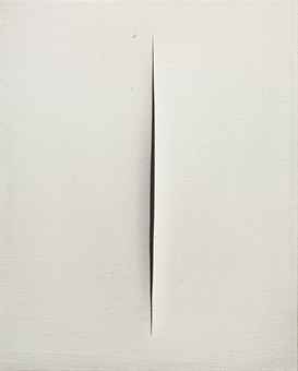 Lucio Fontana (1899-1968) Concetto spaziale, Attesa firma, titolo e iscrizione l. Fontana "Concetto Spaziale" Attese alla Scala si ballano i balletti perfetti (sul retro) idropittura su tela cm 47x38,2 Eseguito nel 1965 Provenance Vismara Arte Contemporanea, Milano Studio Bellini, Milano Literature E. Crispolti, Lucio Fontana: catalogue raisonné des peintures, sculptures et environnements spatiaux, Bruxelles 1974, vol. II, p. 161, n. 65 T 26 (illustrato) E. Crispolti, Fontana. Catalogo Generale, Milano 1986, vol. II, p. 562, n. 65 T 26 (illustrato) E. Crispolti, Lucio Fontana. Catalogo ragionato di sculture, dipinti, ambientazioni, Milano 2006, vol. II, p. 750, n. 65 T 26 (illustrato)