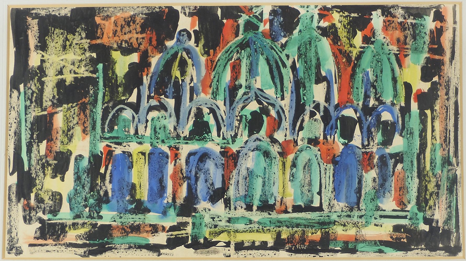 Nino Perizi Trieste 1917-1994 "Composizione a colori" cm. 40x70 - tempera su carta Firmato b. al centro.
