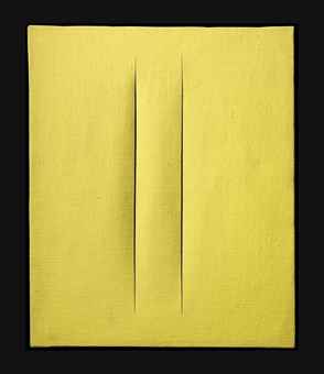 Lucio Fontana (1899-1968) Concetto spaziale, Attese firma, titolo e iscrizione l. Fontana "Concetto Spaziale" Attese credo che bisogna [sic] cambiare le caldaie (sul retro) idropittura su tela cm 46x38 Eseguito nel 1965-66 Provenance Galleria dell'Oca, Roma Milano, asta Christie's, 17 novembre 1999, lotto 192 ivi acquisito dall'attuale proprietario Literature E. Crispolti, Lucio Fontana. Catalogo ragionato di sculture, dipinti, ambientazioni, Milano 2006, vol. II, p. 821, n. 65-66 T 20 (illustrato)