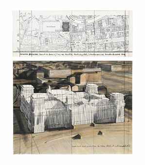 Christo (N. 1935) Wrapped Reichstag (project for Berlin) firmato e datato Christo 1979 (in alto a sinistra sull'elemento in alto); titolo Wrapped Reichstag (project for Berlin) (in basso a sinistra sull'elemento in alto) pastelli, matita, stoffa, spago e carta su cartone, due elementi cm 27,7x71 (elemento superiore) cm 55,7x71 (elemento inferiore) cm 83,4x71 (totale) Eseguito nel 1979 Autentica dell'artista su fotografia, 2007