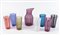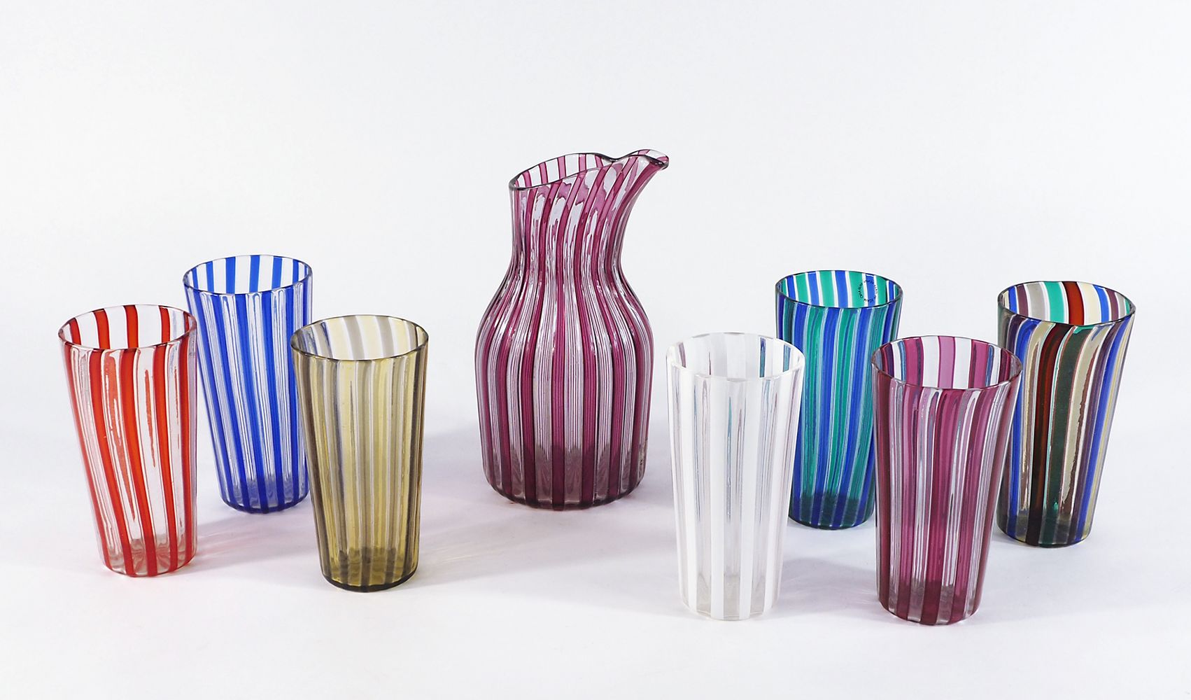 Venini: lotto in vetro lavorato a canne composto da brocca e 7 bicchieri. Firme incise Venini Italia 83, alcuni con etichette trasparenti.