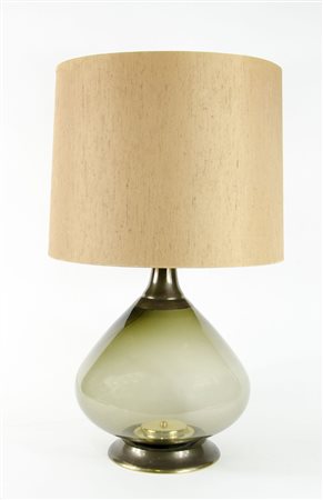 Lampada da tavolo in vetro trasparente verde con base in ottone, paralume in stoffa. H. tot cm. 72.