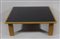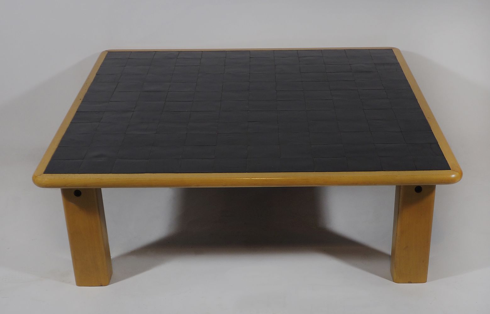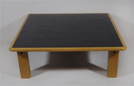 Ibisco: tavolo basso quadrato in legno chiaro con interno a riquadri in cuoio nero. Con etichetta originale. cm. 35x102x102.