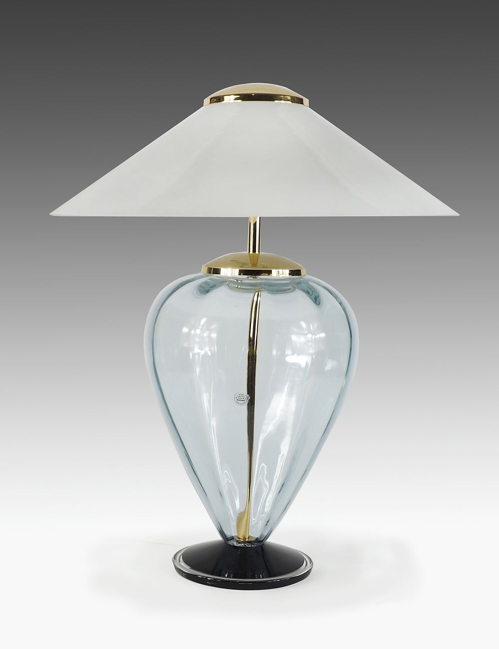 Grande lampada da tavolo in vetro di Murano trasparente con paralume lattimo. H. cm. 65.
