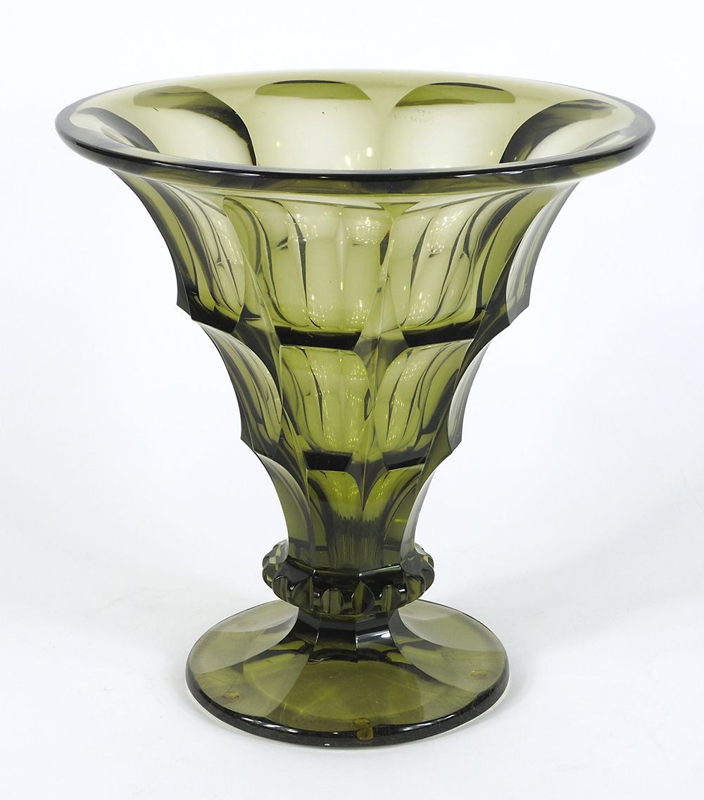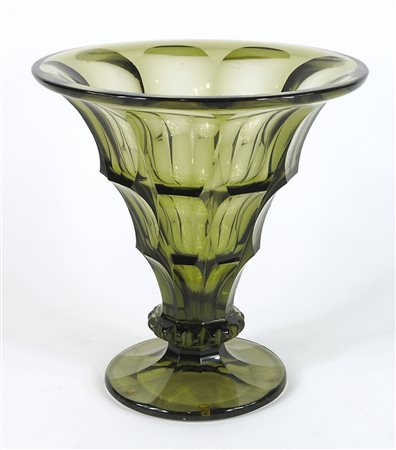 Moser: grande vaso a coppa in vetro trasparente verdino sfaccettato. Disegno di H.A. Hussmann 1929, timbro all'acido sotto la base. H. cm. 28. Pubbl.: catalogo "Moser 1857-1997" a cura di J. e L. Pankova, pag. 105.