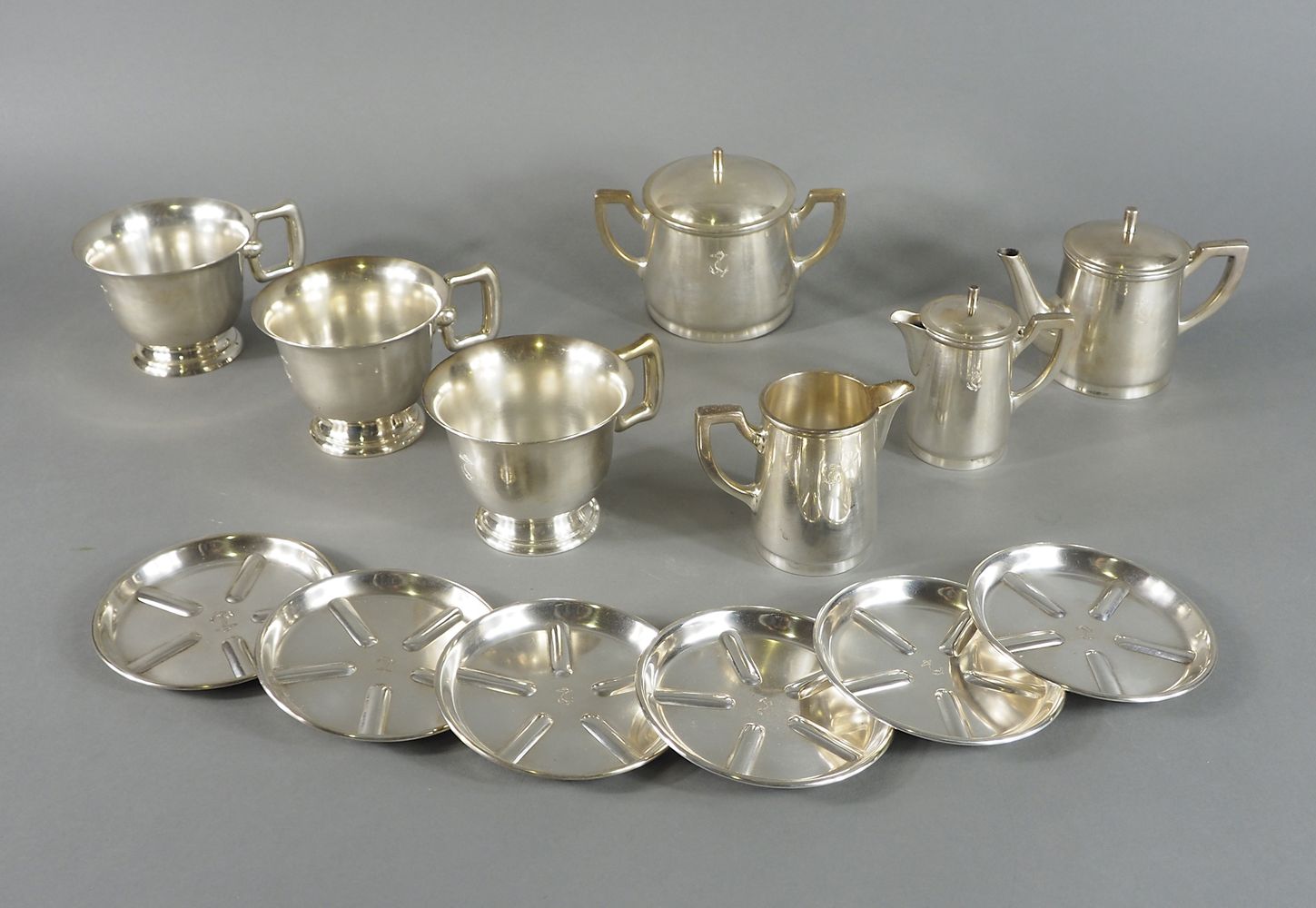 Lotto di vari oggetti da nave in metallo argentato con stemma.